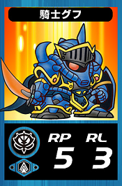 - GC0060騎士グフ 生命力900 攻撃力200 防御力180 特殊効果無し 進化段階1段階目 入手先ラクロアの勇