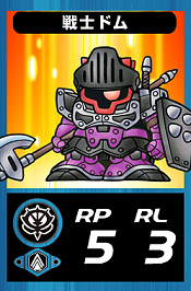 - GC0058戦士ドム 生命力750 攻撃力180 防御力190 特殊効果無し 進化段階1段階目 入手先ラクロアの勇